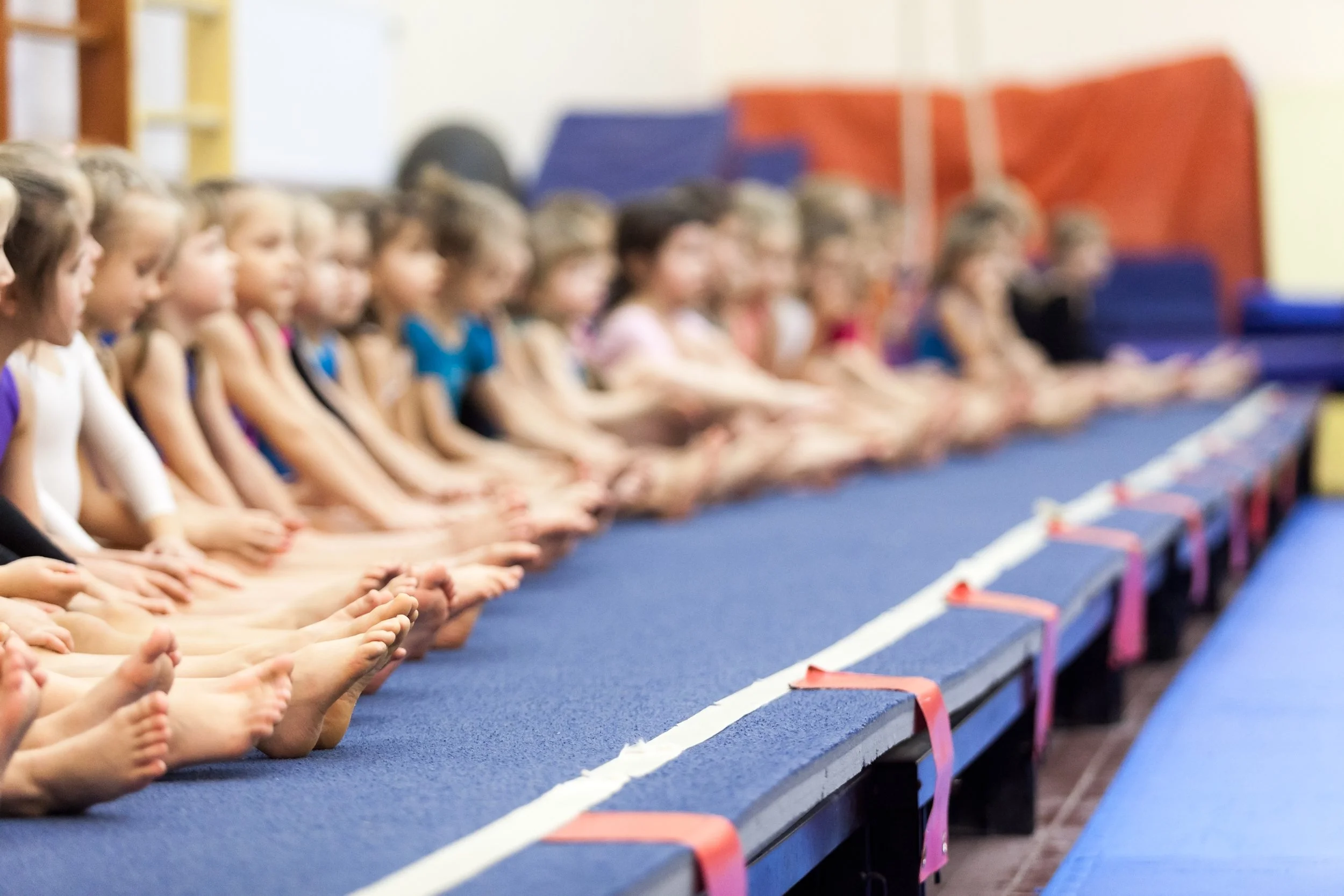 A structured preschool gymnastics class introducing vault, bars, beam, and floor in age-appropriate rotations. Students learn listening skills, basic shapes, jumps, rolls, balance, coordination, and safe progressions.